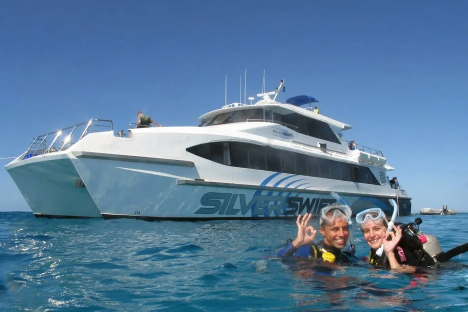 Pour découvrir la Grande Barrière, embarquez avec Silverswift depuis Cairns. Ce Catamaran, pouvant accueillir jusqu’à 85 personnes, est moderne et rapide et offre toutes les commodités nécessaires (toilettes, douches chaudes, vestiaires, bar, espace couvert intérieur).